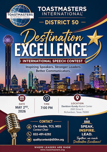 Here are some common questions about the Evaluation and International Speech Contests in District 50 for the 2025-2026 season. Answers draw from the Toastmasters International Speech Contest Rulebook and District 50 resources. For full details, check the 2025-2026 Speech Contest Rulebook.