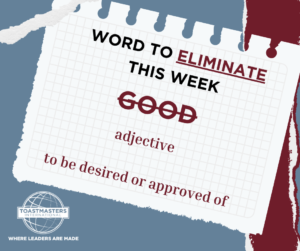 This week, we’re flipping the script on one of the most overused words in our vocabulary: GOOD. It’s easy. It’s safe. But in Toastmasters, we strive to stretch our vocabulary and sharpen our impact—and “GOOD” just doesn’t cut it anymore! You may say it’s not “GOOD” enough.